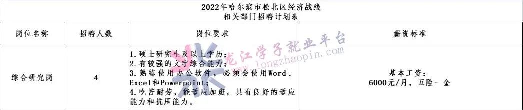 招聘岗位要求、人数及薪金标准详见《2022年哈尔滨市松北区经济战线相关部门招聘计划表》(以下简称“《招聘计划表》”,见“附件1”)。