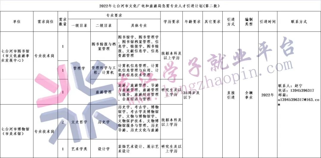 具体职位、人数、资格条件等详见《2022年七台河市文化广电和旅游局急需专业人才引进计划》(附件一)。有关专业要求可参照《黑龙江省考试录用公务员专业设置指导目录》。