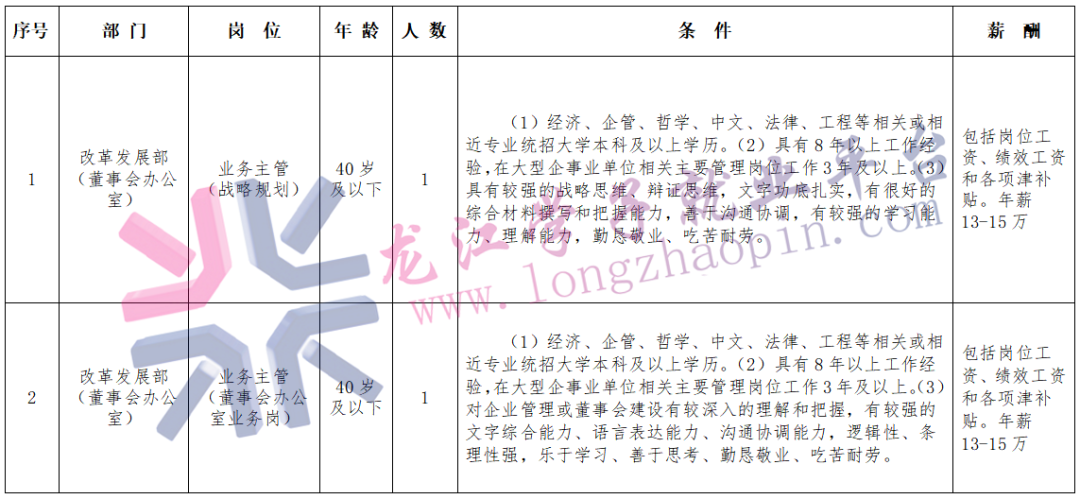 集团改革发展部(董事会办公室)计划招聘管理人员2人,其中战略规划岗主管1人、董事会办公室业务岗主管1人。