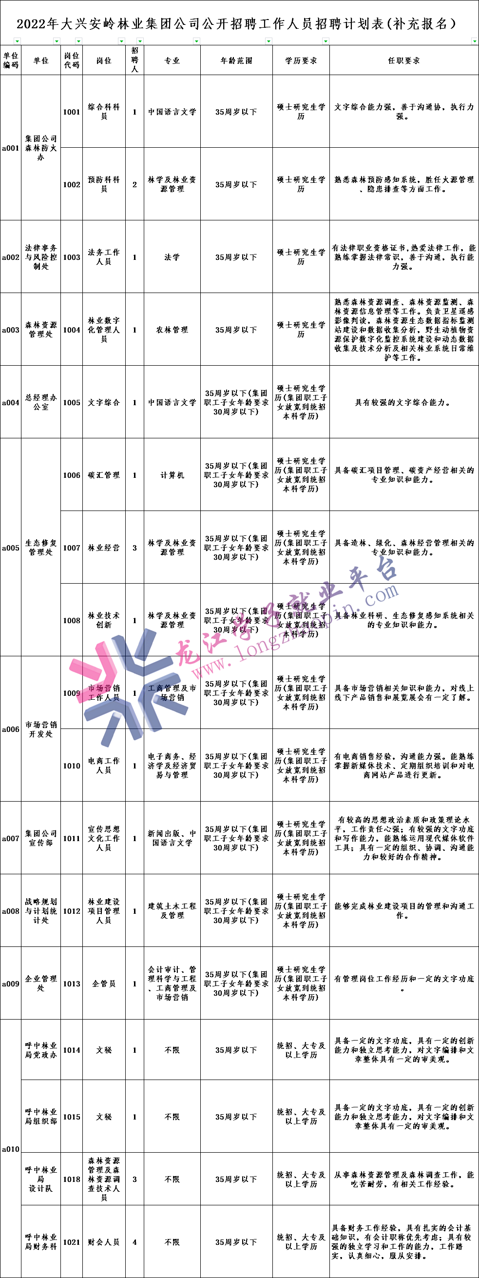 2022年大兴安岭林业集团公司公开招聘工作人员招聘计划表(补充报名).xls