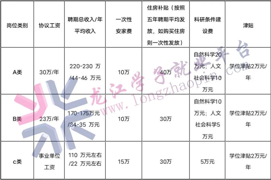 2.按照《大庆师范学院高层次人才引进暂行办法》(附件5)相关规定,与学校签订人才引进协议,兑现人才待遇。其中,博士可申报A、B、C三类岗位,相关待遇如下: