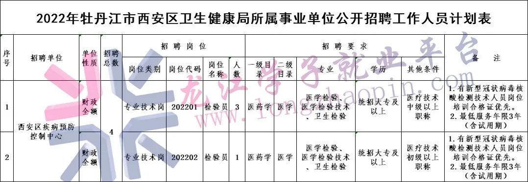 本次计划公开招聘区疾病预防控制中心专业技术人员4名,具体招聘岗位、人数、条件等情况详见《2022年牡丹江市西安区卫生健康局所属事业单位公开招聘工作人员计划表》(附件1,以下简称《招聘计划表》)。
