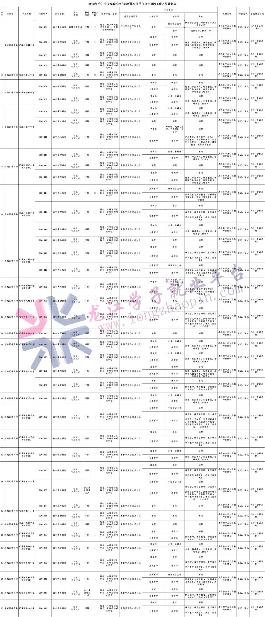 此次公开招聘事业单位工作人员104人,具体招聘岗位、人数、条件等详见《2022年哈尔滨市双城区教育局所属事业单位公开招聘工作人员计划表》(以下简称《招聘计划表》)。