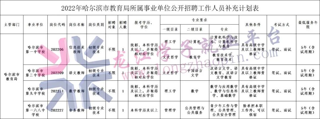 依据《2022年哈尔滨市教育局所属事业单位公开招聘工作人员公告》,招聘对象为自主就业退役士兵(岗位代码为:202206、202209、202214、202227)岗位报名没有达到1:3比例,现发布招聘补充公告,面向社会公开招聘。具体招聘岗位、人数、条件等详见《2022年哈尔滨市教育局所属事业单位公开招聘工作人员补充计划表》,其余事项仍然按照《2022年哈尔滨市教育局所属事业单位公开招聘工作人员公告》规定组织实施。