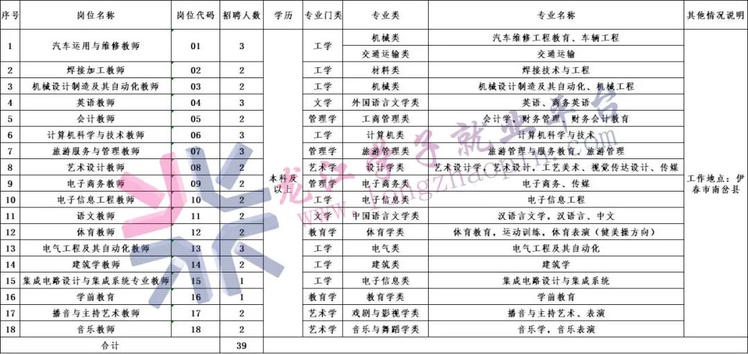 本次面向社会公开招聘39名教师,具体招聘岗位和相关要求详见《伊春技师学院2022年公开招聘教师岗位表》(附件1)。