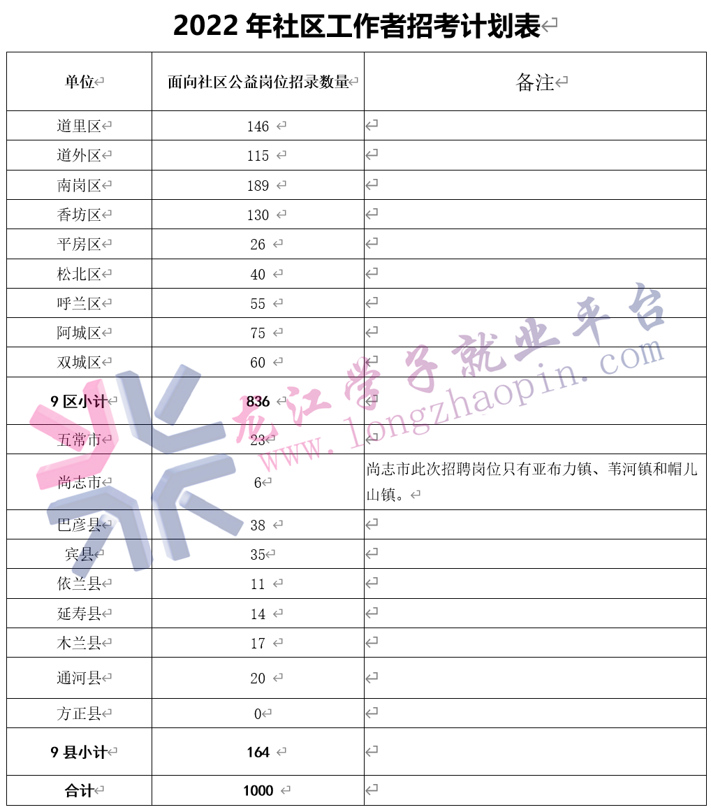 此次全市面向社区公益岗位专项招考社区工作者1000人。具体招聘数量详见《2022年社区工作者招考计划表》。