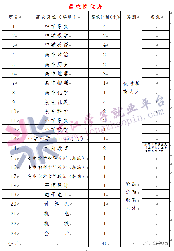 为加快推进我县教育现代化进程,结合我县教师队伍建设的实际,根据《长兴县引进优秀教育人才和紧缺急需教育人才实施办法》(长政办发〔2019〕54号)文件精神,决定引进优秀教育人才和紧缺急需教育人才40名,现将有关事项公告如下: