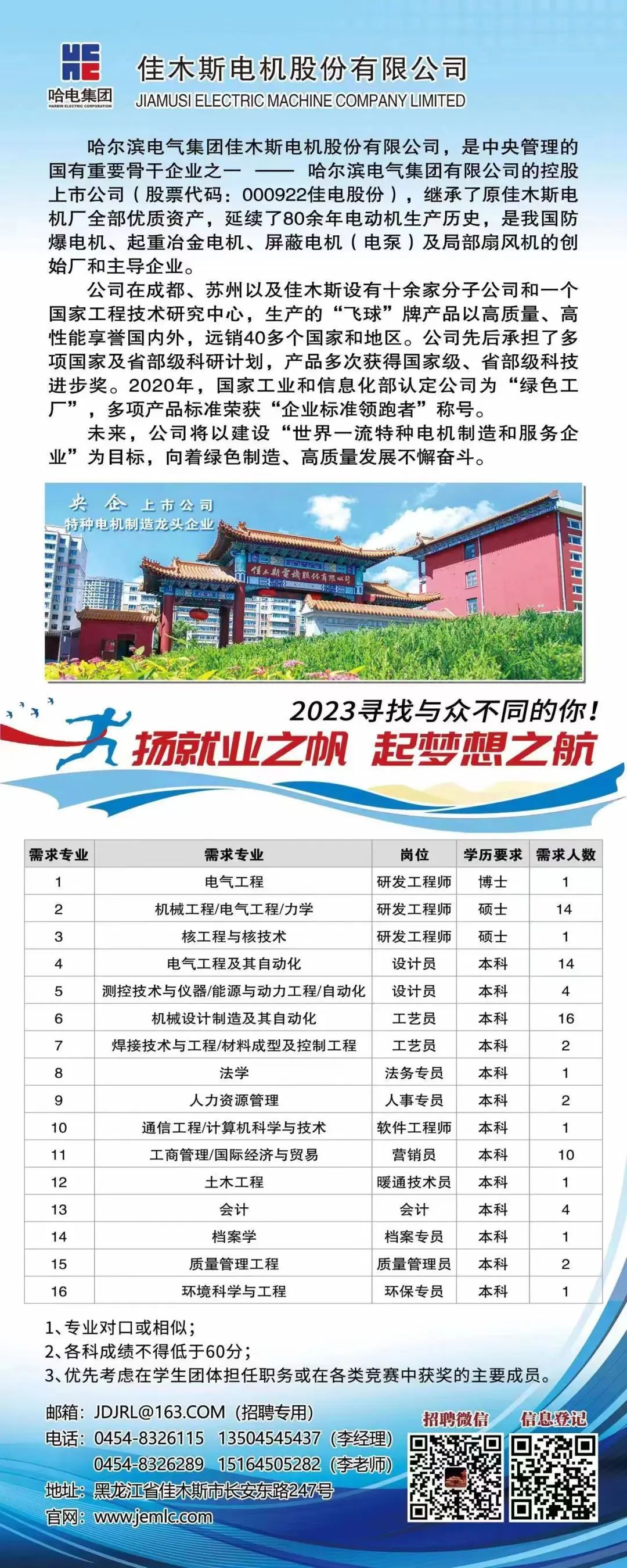 哈尔滨电气集团佳木斯电机股份有限公司(以下简称“公司”)隶属哈尔滨电气集团有限公司。哈尔滨电气集团有限公司是党中央管理的51户国有重要骨干企业之一。公司承继了佳木斯电机厂全部优质资产,延续了80余年生产电动机的历史,是我国大中型、特种电机的创始厂和主导厂,研制出了我国第一台防爆电机、第一台起重冶金电机、第一台屏蔽电机、第一台局部扇风机和第一台正压型防爆电机,现已发展成为拥有年生产能力1000万千瓦以上的国内产品链齐全、具有一定竞争力的特种电机企业,先后获得了企业标准“领跑者”证书、“绿色工厂”、国家标准化一级企业、国家一级计量单位、国家出口创汇先进企业、全国五一劳动奖状等荣誉称号。