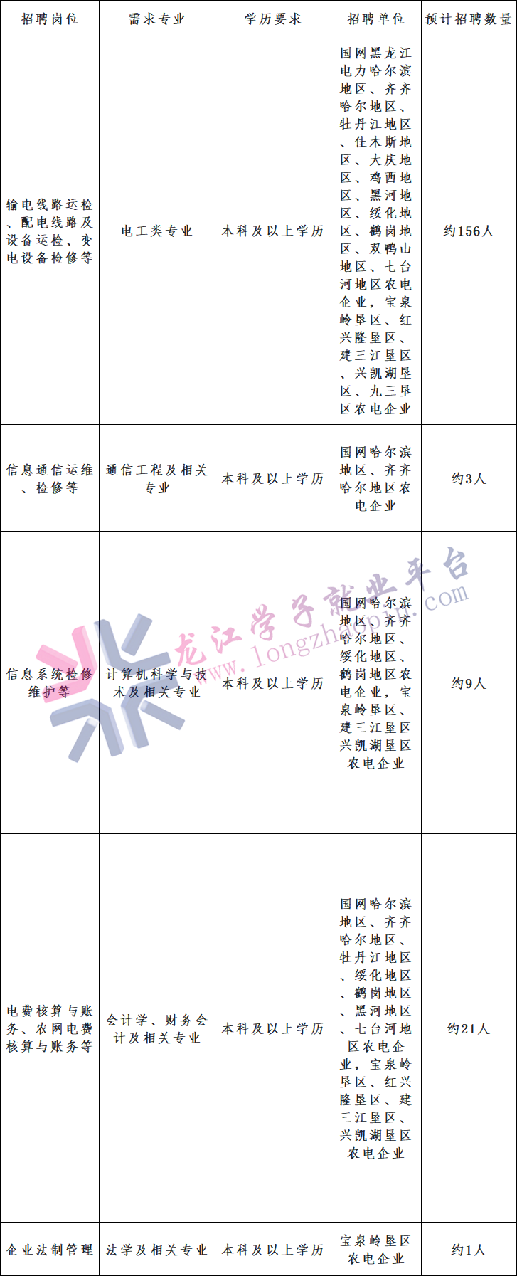 国网黑龙江省电力有限公司是国家电网有限公司全资子公司、特大型国有骨干企业,承担着建设、运行维护黑龙江电网和全供电区安全可靠供电的任务。公司供电面积47万平方公里,占东北供电区域总面积的58.3%,服务各类客户1810万户,供电人口3185万。直接管理单位33个,其中地市级供电企业13个,农垦及县供电企业80个。共有500千伏变电站18座、运行容量2041万千伏安;220千伏变电站151座、运行容量3270万千伏安;500千伏线路52回、总长7071千米;220千伏线路520回、总长16465千米。总装机容量为3802万千瓦,系统最大负荷1721万千瓦。先后荣获全国文明单位、全国五一劳动奖状等称号。根据公司发展需要,为充实一线岗位,欢迎有志投身于国网黑龙江电力的学子踊跃报名。