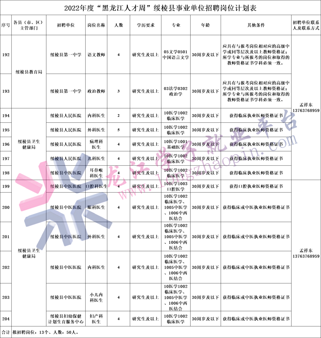 绥棱县教育卫生所属事业单位计划招聘50人,其中教育类7人、卫生类43人。具体岗位要求详见《2022年度“黑龙江人才周”绥棱县事业单位招聘岗位计划表》(附件1)。