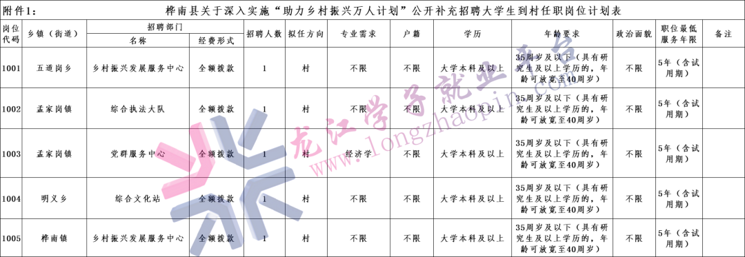 桦南县用乡镇事业编制公开招聘本科及以上学历毕业生5人到村任职。具体招聘岗位、人数详见《桦南县关于深入实施“助力乡村振兴万人计划”公开补充招聘大学生到村任职岗位计划表》。