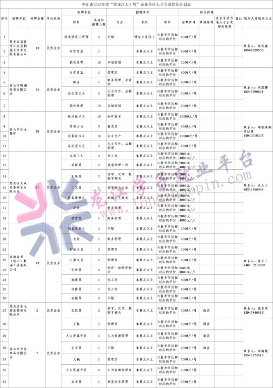 本次计划集中引进企、事业单位人才169人,其中事业单位81人、域内企业(公开招聘由企业自行组织招聘)88人。具体招聘岗位、条件等详见《密山市2022年度“黑龙江人才周”事业单位人才引进岗位计划表》(附件1)、《密山市2022年度“黑龙江人才周”企业单位人才引进岗位计划表》(附件2)。