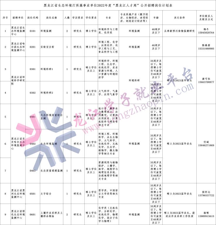 具体详见《黑龙江省生态环境厅所属事业单位2022年度“黑龙江人才周”公开招聘岗位计划表》(附件1,以下简称《计划表》)