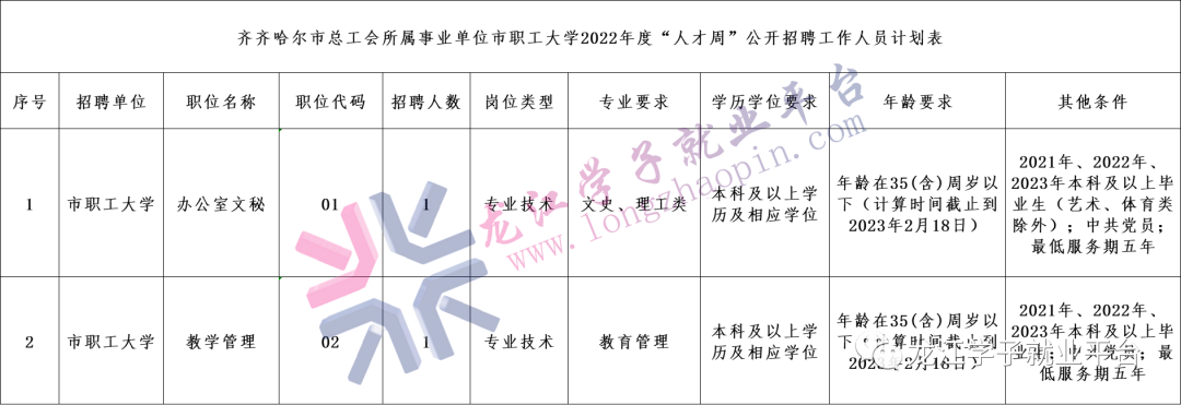 齐齐哈尔市职工大学计划公开招聘工作人员2名。具体岗位详见《齐齐哈尔市总工会所属事业单位市职工大学2022年度“人才周”公开招聘工作人员计划表》(附件1)。