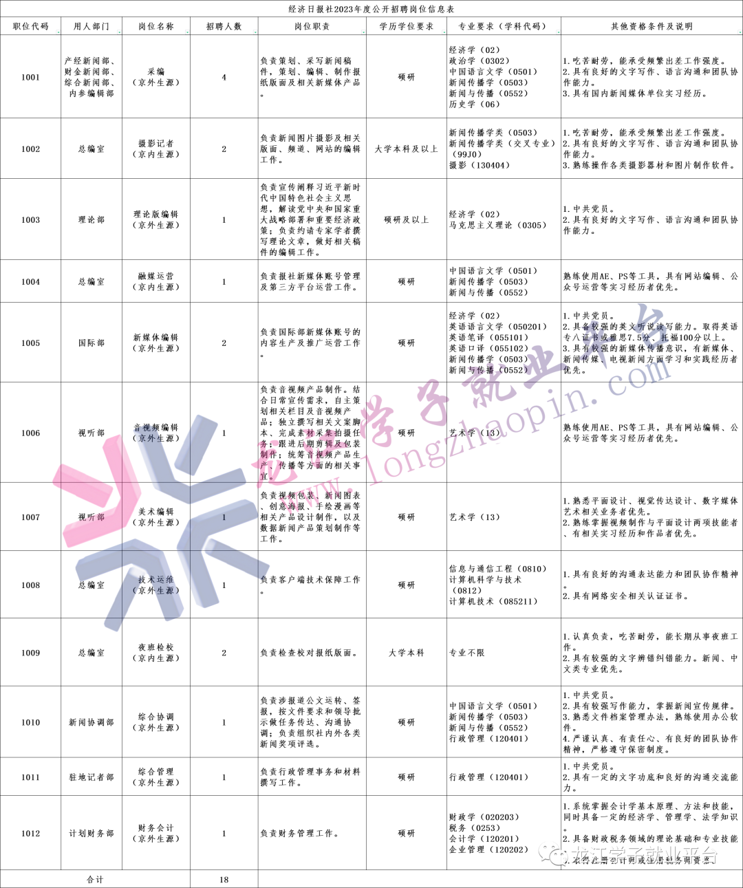 具体岗位及资格条件详见《经济日报社2023年度公开招聘岗位信息表》。其中,有关岗位专业条件参考教育部公布的专业目录。