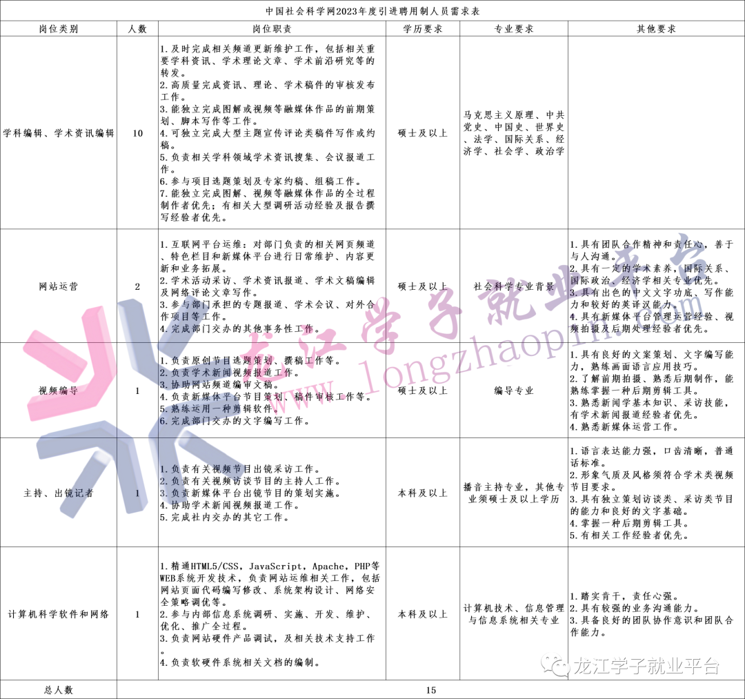 具体岗位及相关要求,详见附件《社科网编辑中心2023年度引进聘用制人员需求表》。