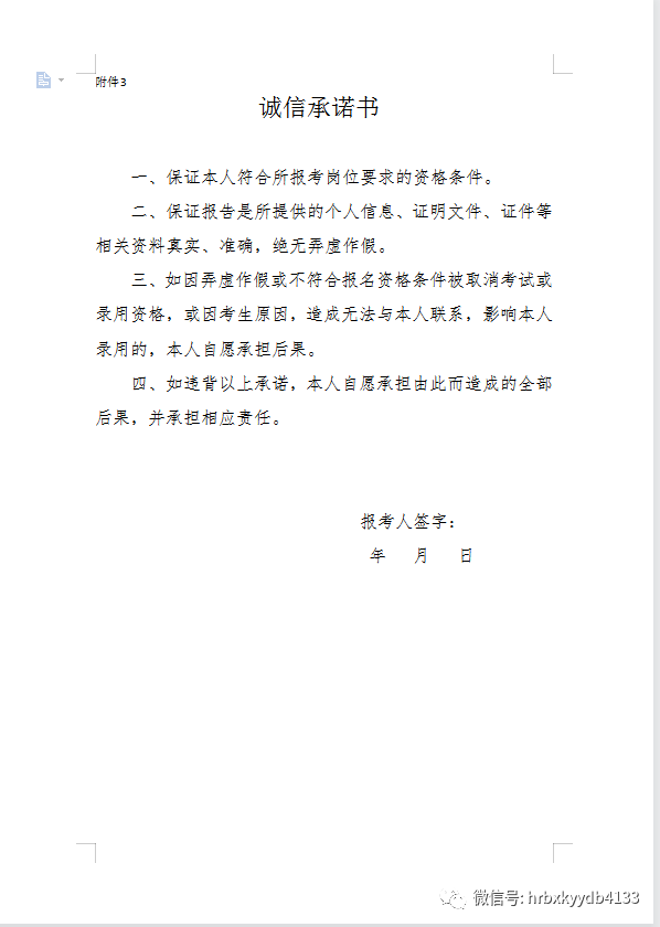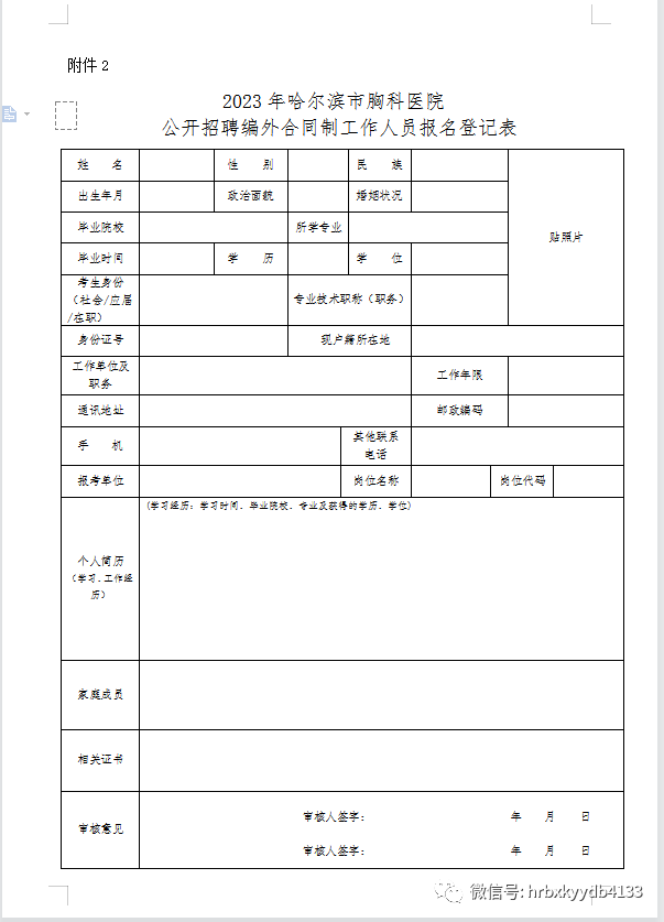 本次招聘实行网上报名,同时进行资格确认。考生可在医院微信公众号下载《2023年哈尔滨市胸科医院公开招聘编外合同制工作人员报名登记表》(以下简称《报名登记表》附件2),认真填写后,按照报名流程进行网上报名。