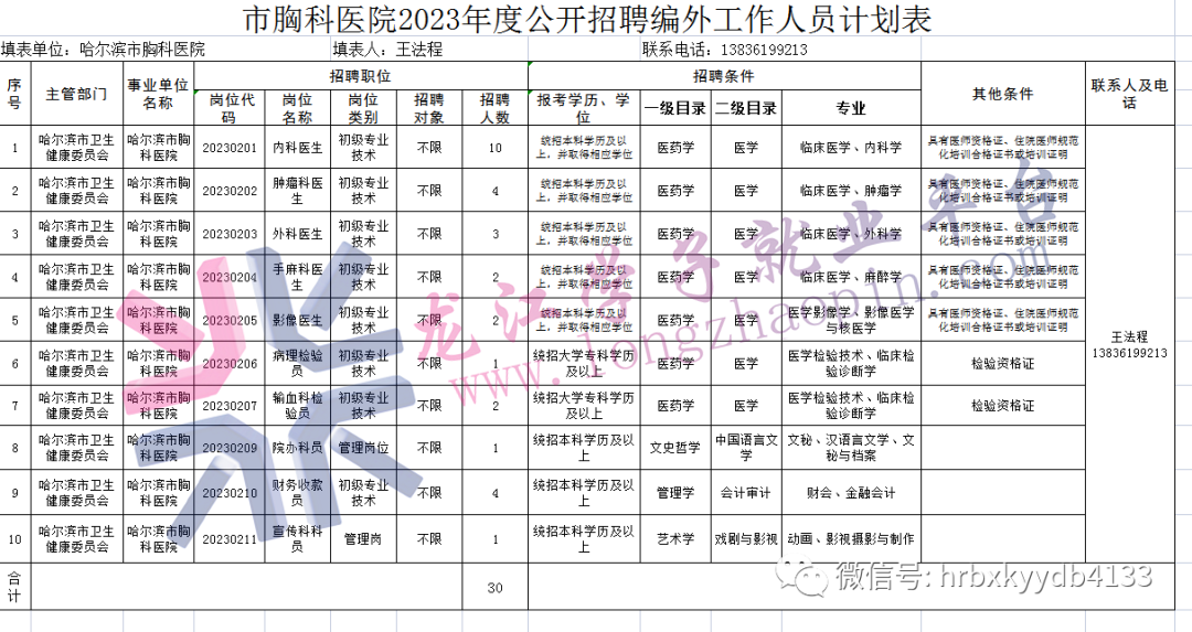 此次公开招聘编外合同制工作人员30人。具体招聘岗位、人数、条件等详见《2023年哈尔滨市胸科医院公开招聘编外合同制工作人员计划表》(以下简称《招聘计划表》附件1)。