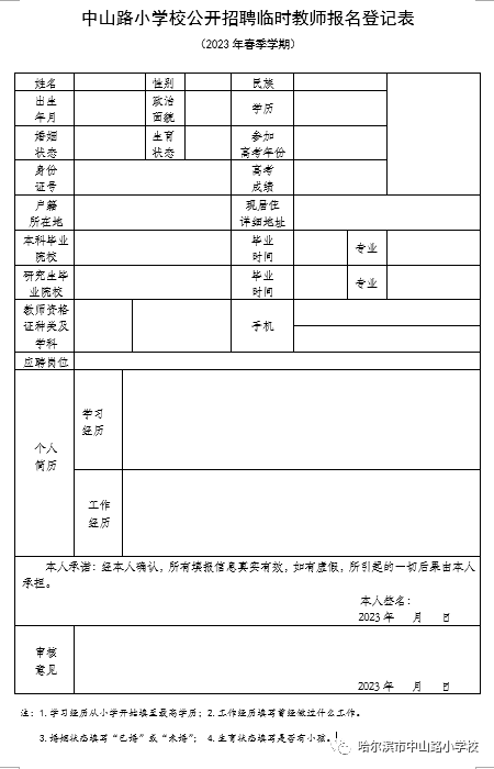 1.个人申请报名。报名采取网上报名方式,报名者需填写《中山路小学公开招聘临时教师报名登记表》(以下简称《报名登记表》),并将此表上传至指定邮箱。