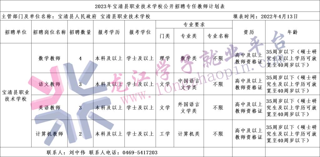 此次计划招聘中小学专任教师104名,职业技术学校专任教师12人,详细信息见《2023年宝清县公开招聘中小学专任教师岗位计划表》(附件1)、《2023年宝清县职业技术学校公开招聘专任教师计划表》(附件2)。