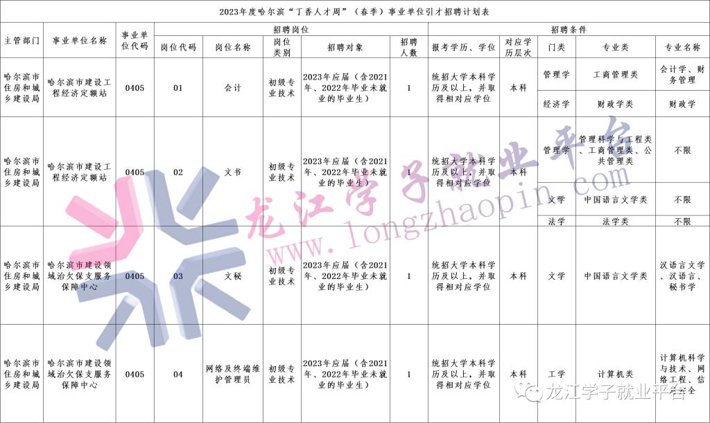 此次公开招聘事业单位工作人员4人。具体招聘岗位、人数、条件等详见《2023年度哈尔滨“丁香人才周”(春季)事业单位引才招聘计划表(市住建)》(以下简称《招聘计划表》)。