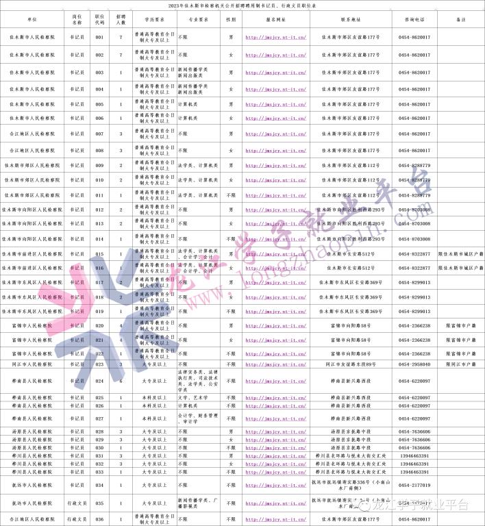 1.职位查询。各检察院招考人数、具体职位等详见附件《2023年佳木斯市检察机关公开招聘聘用制书记员、行政文员职位表》。