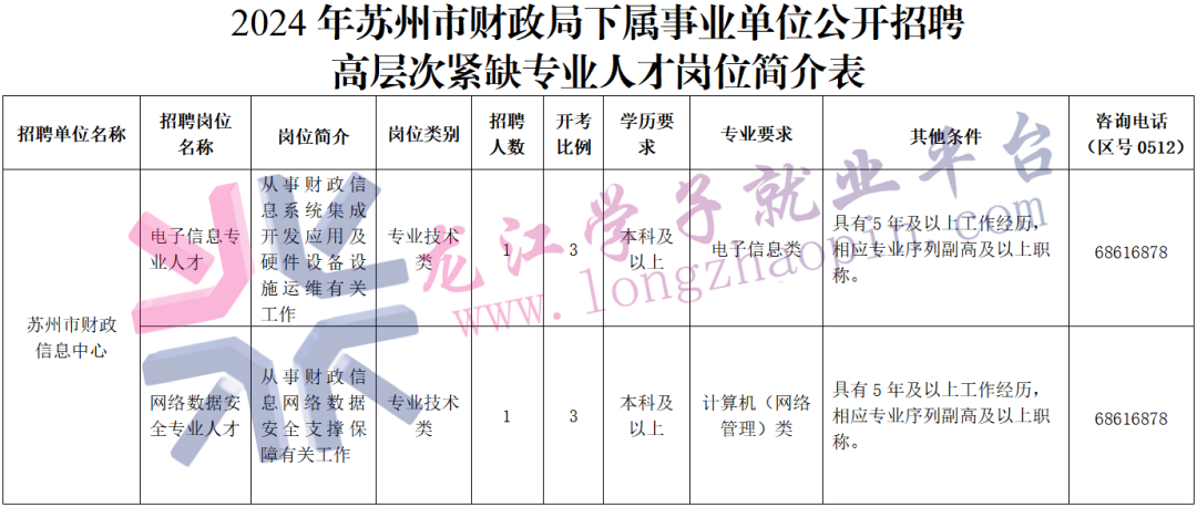 招聘岗位及条件等详见《2024年苏州市财政局下属事业单位公开招聘高层次紧缺专业人才岗位简介表》(附件1)。可在苏州市人力资源和社会保障网