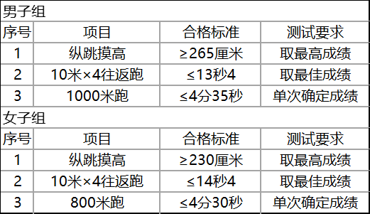 (1)体能测评项目及通过标准:纵跳摸高、10米×4往返跑、男子组1000米跑、女子组800米跑。