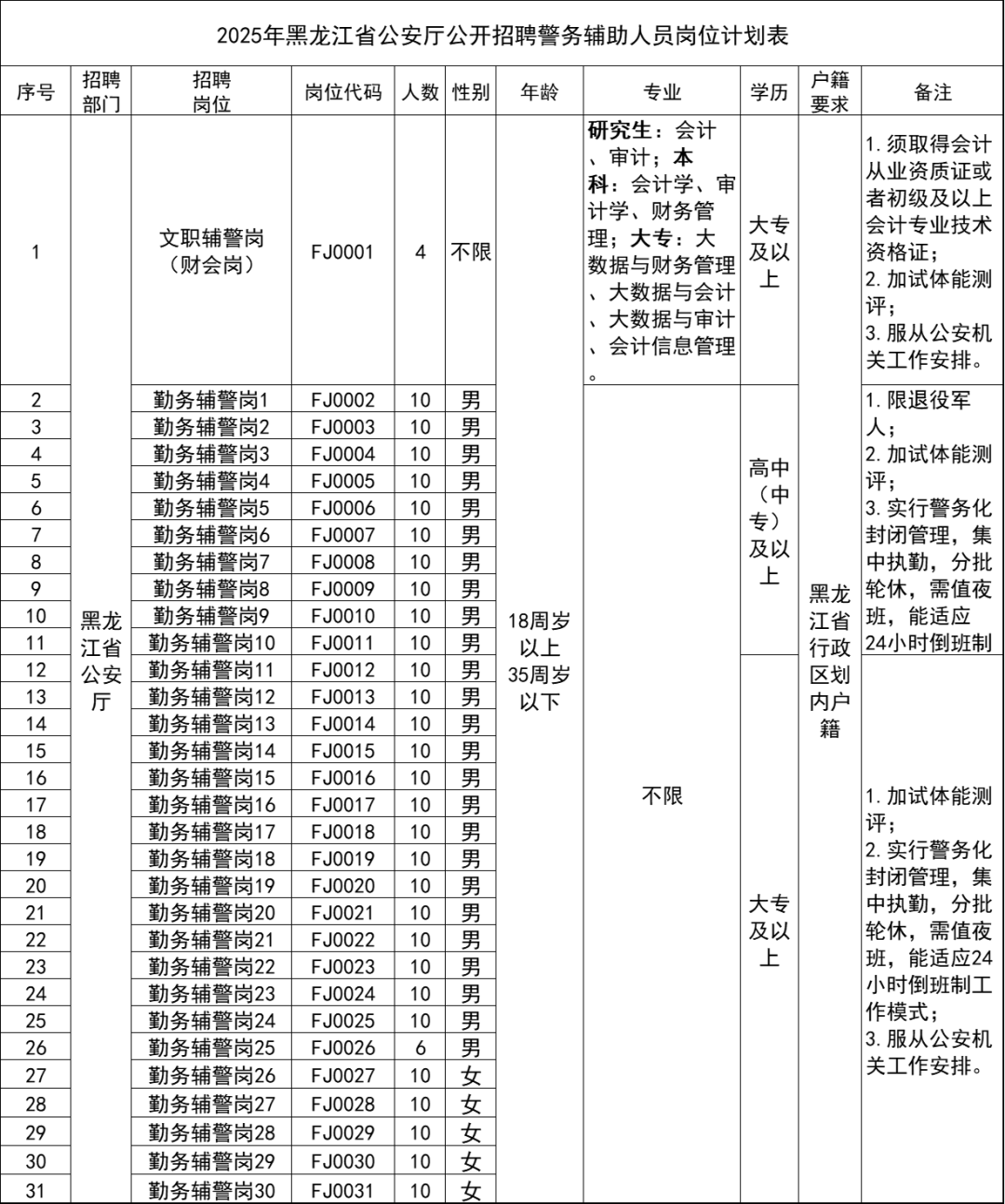 附件1:黑龙江省公安厅2025年公开招聘警务辅助人员岗位计划表